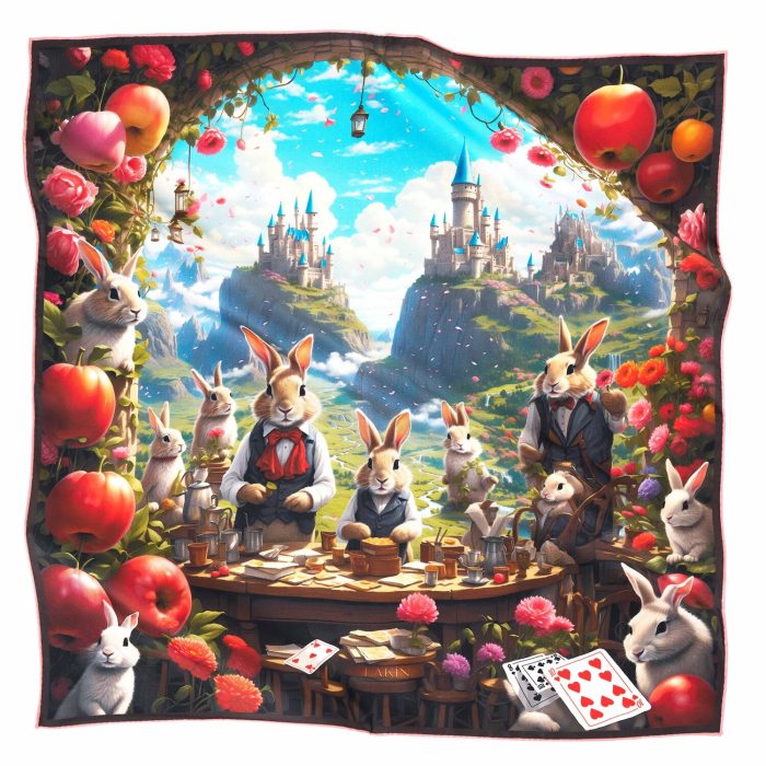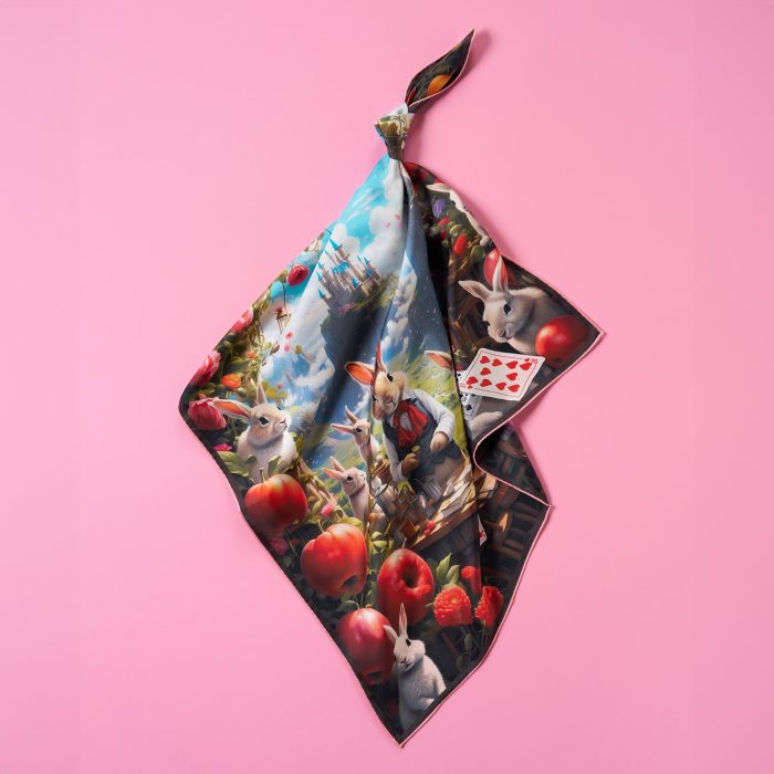 In a world where everything is fairytale-like, bunnies in bow ties and waistcoats are gathered around a table. Other rabbits are watching these rabbits with curious eyes from around the table. The front of the scarf design features playing cards, which act as an invitation to a game. The scene is set by ancient stones and castles, with apples and flowers adding to the fairytale feel.